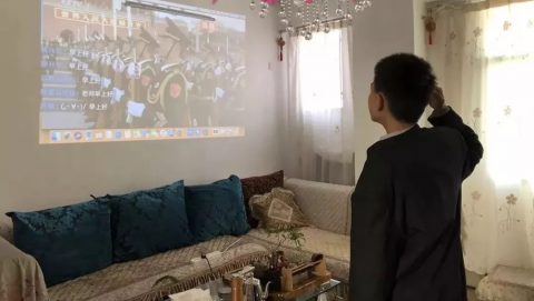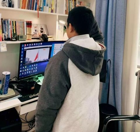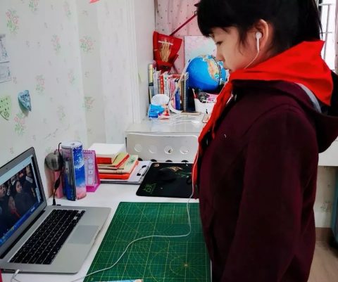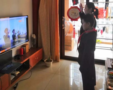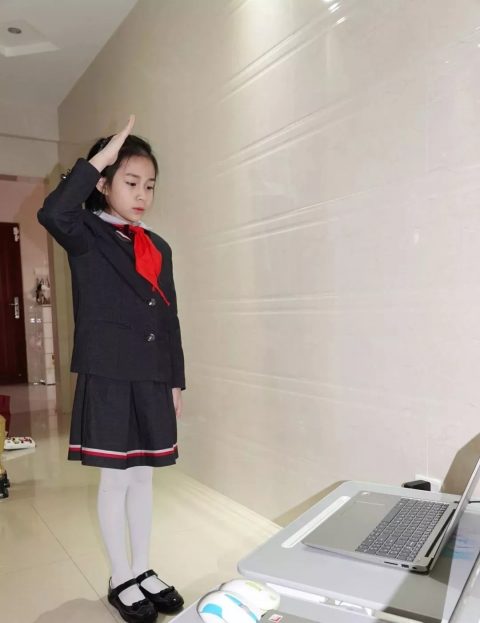 当国歌奏响时,学生和家长们隔着手机或电脑屏幕,起立行注目礼。