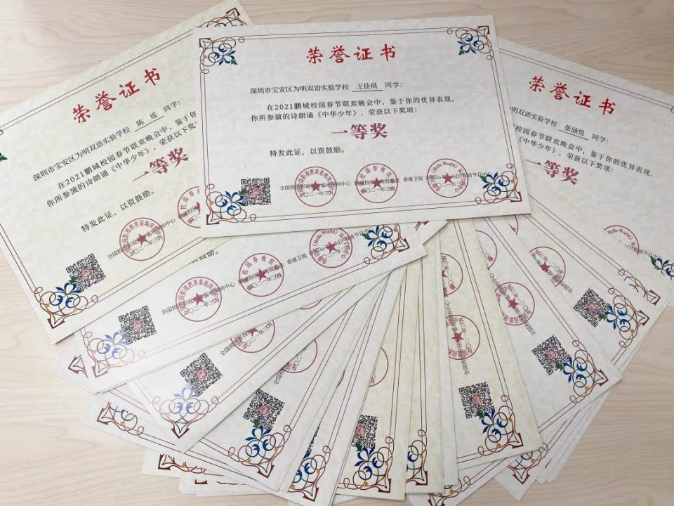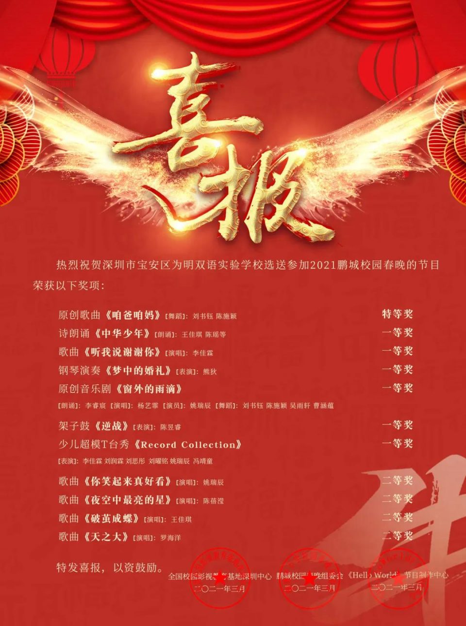喜报!喜报!喜报!——宝安为明学子在“2021鹏城校园春节联欢晚会”获奖喜讯