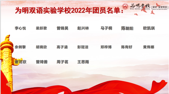 为迎接党的二十大胜利召开,庆祝建团100周年,加强学校共青团队伍建设,激励青少年坚定理想信念,绽放青春力量,勇担时代责任,宝安区为明双语实验学校举行了2022年入团仪式,学校领导、新团员和老团员代表参加了本次活动。